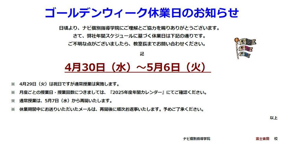 さて、表題の通りゴールデンウィークの休業のご案内です。