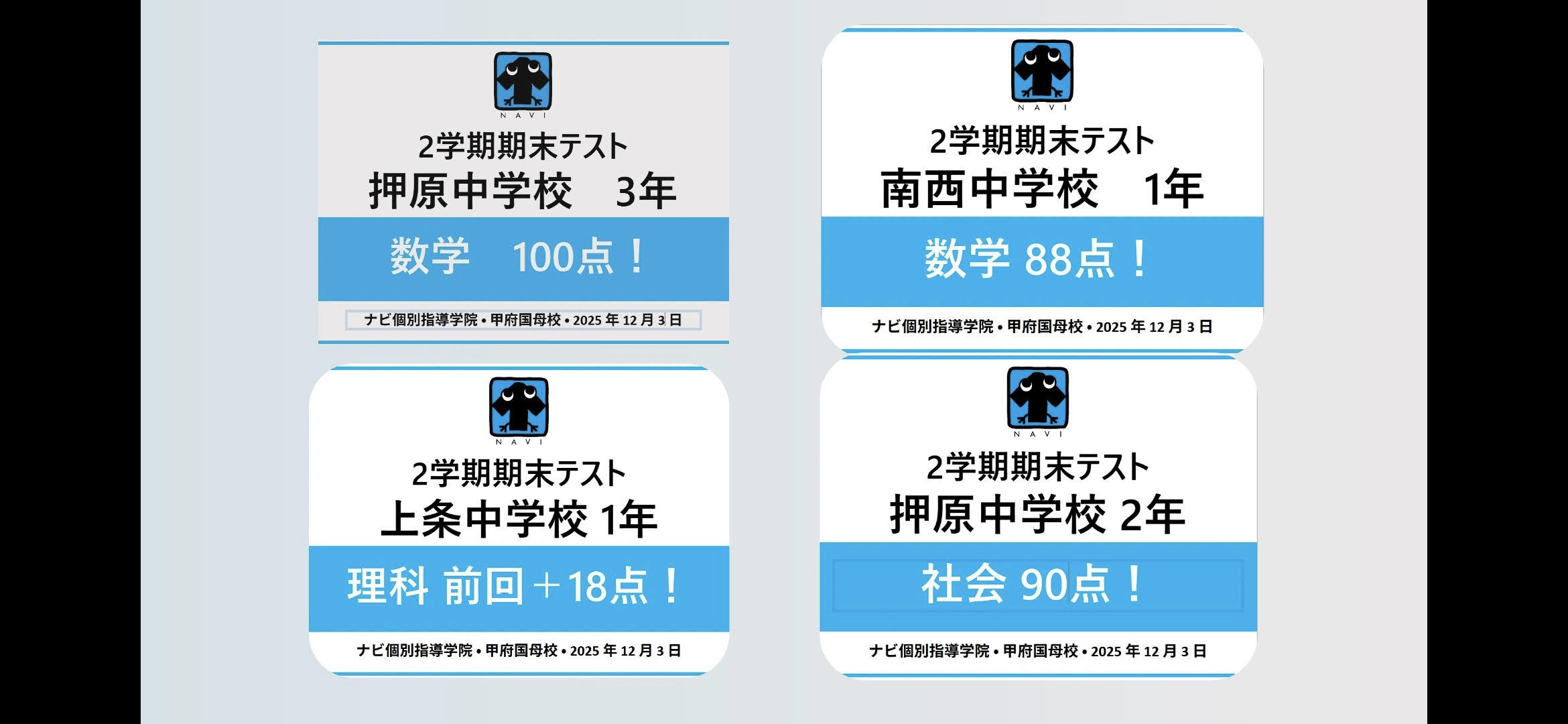 ここで紹介させていただいた生徒以外にも、たくさん成績が上がった報告をいただいています!
