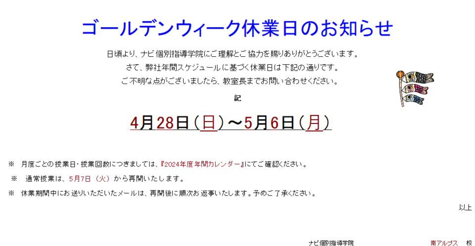 ※休業期間中にお送りいただいたメールは、再開後に順次お返事いたします。予めご了承ください。