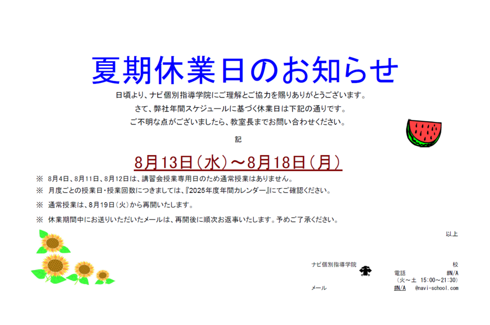 お盆休みも遊びも勉強も充実した生活を過ごしましょう! 生徒の皆さんには元気いっぱいの姿を見られることを楽しみにしています!