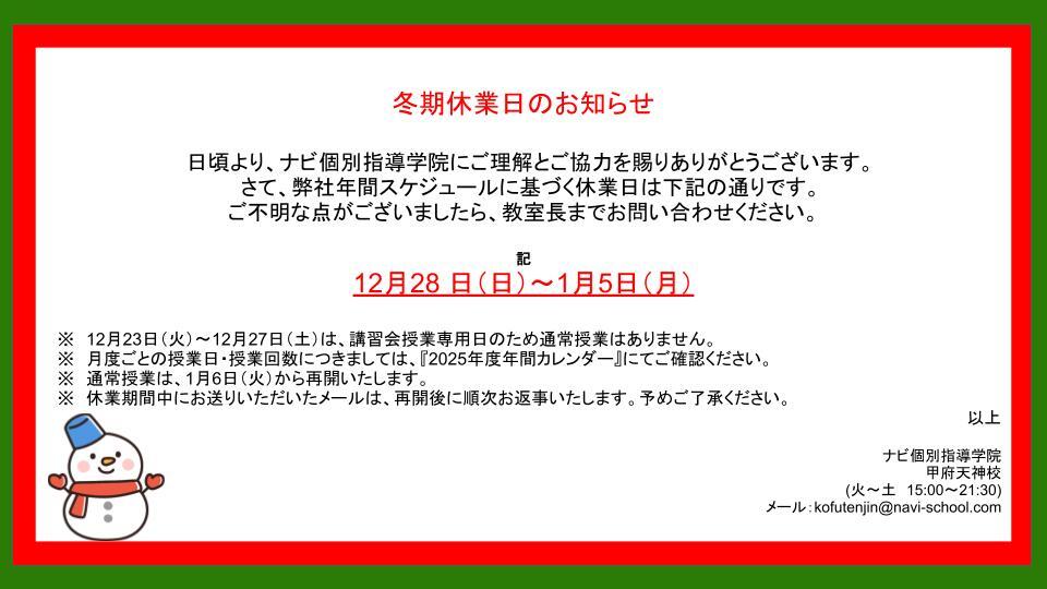 ※12月23日~12月27日は、講習会授業専用日のため、通常授業はありません。