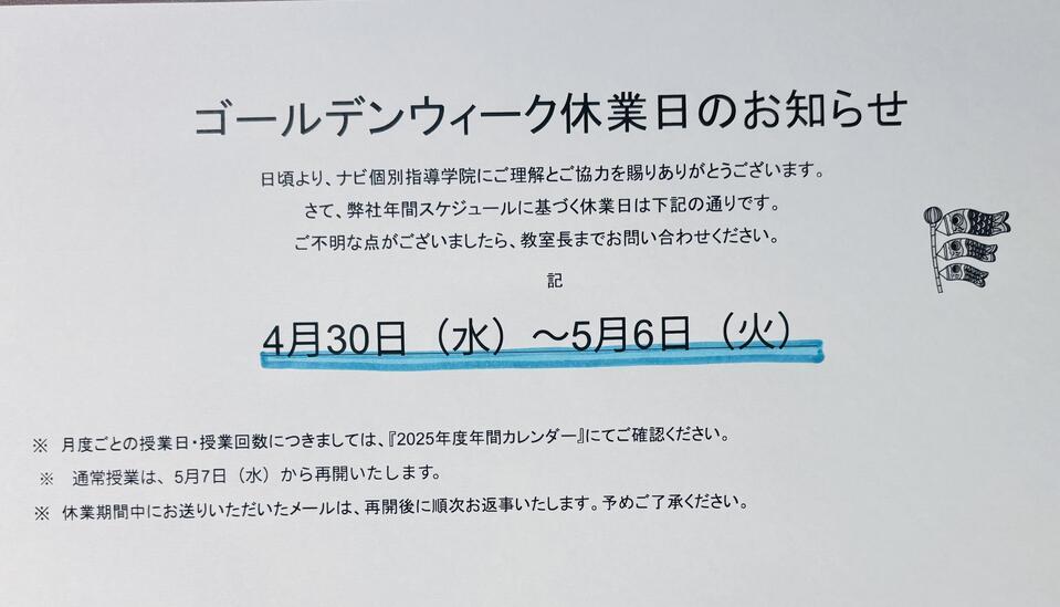 日頃より、ナビ個別指導学院にご理解とご協力を賜りありがとうございます。