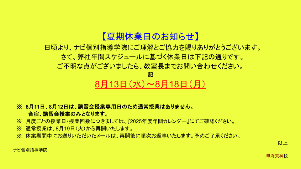 ※8月11日、8月12日は、講習会授業専用日のため、授業はありません。合宿、講習会授業のみ実施いたします。