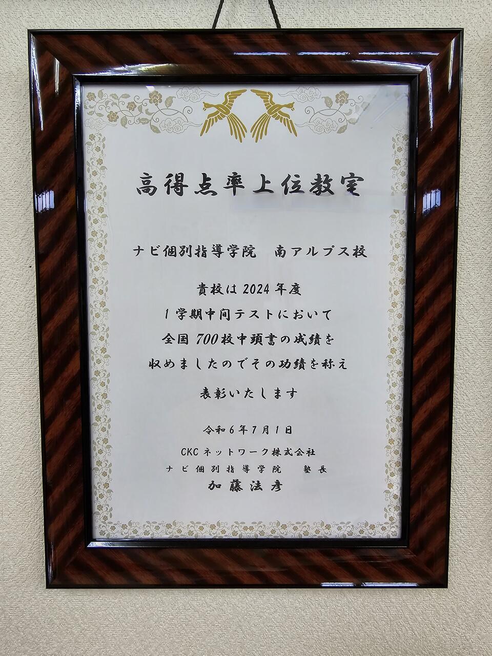 この度南アルプス校に"高得点と取った生徒が多い教室"として表彰されました!
