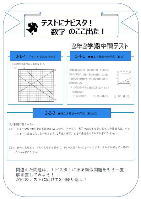 そこで、前回どんな問題が出たのか、ナビ個別の自社教材「ナビスタ!」と近隣中学校の前回定期テストの分析を「ここ出た!」で確認してみましょう!