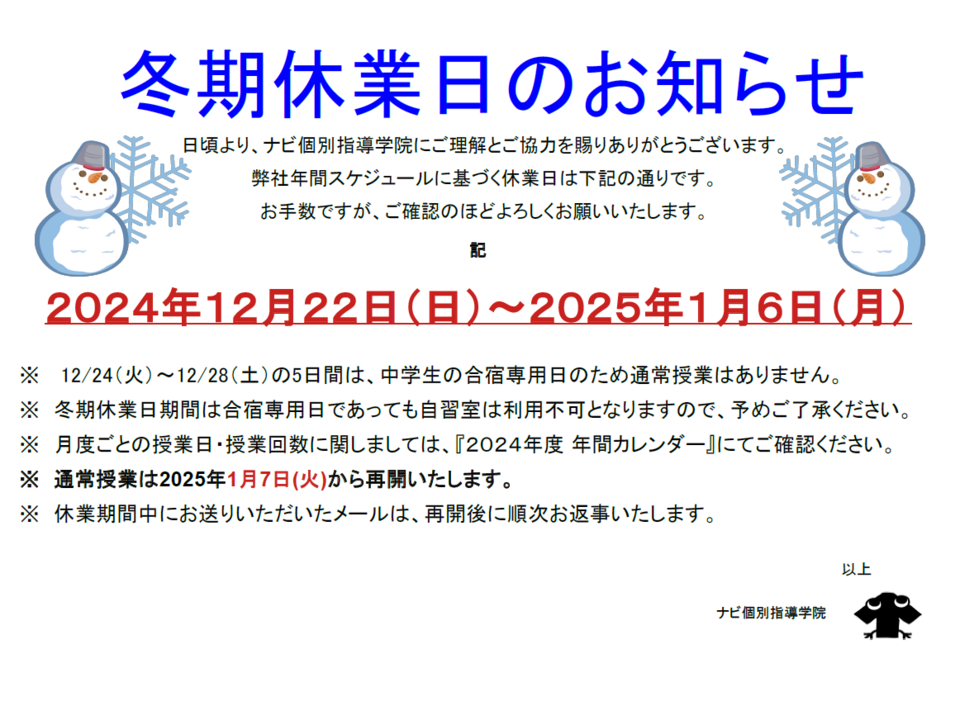 の間、ナビ韮崎校はお休みとさせていただきます。