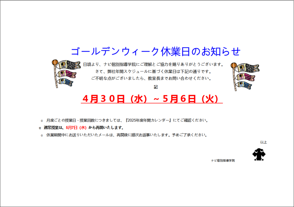 さて、今回はゴールデンウィーク休業日のお知らせです!