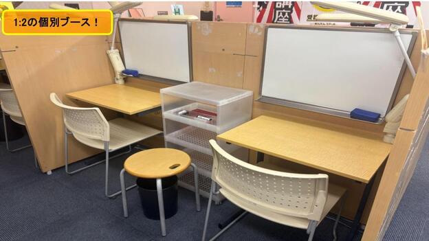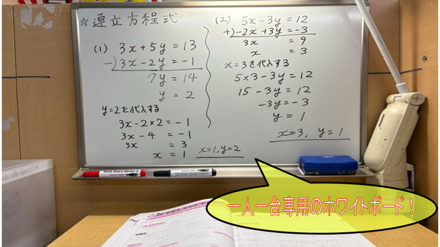 ナビ個別指導学院の授業は、個別の席ごとに設置された自分専用のホワイトボードで解き方や考え方を一緒に確認、それから生徒が問題を解くという「個別授業」スタイルです。
