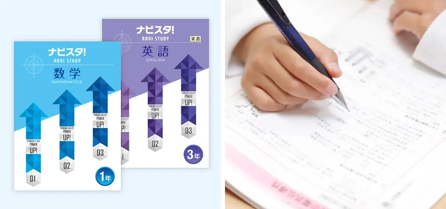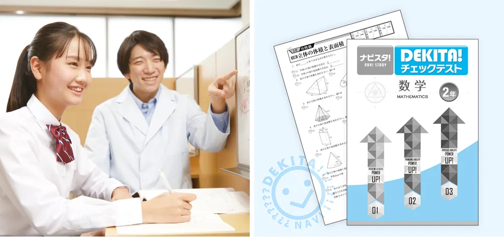 予習授業向けに開発されたオリジナルテキスト「ナビスタ!」は、定期テスト対策にも最適です。レベルに合った問題がひと目でわかるので、基礎から応用問題まで反復学習に適した仕様になっています。