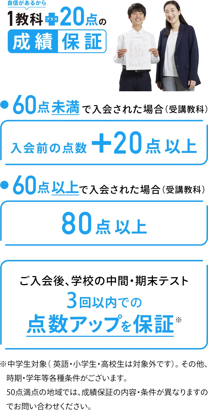 もし、上記の基準を達成できなければ、保証期間後の1学期間(3か月分)対象教科の授業料を免除し(諸経費除く)、無料で指導させていただきます。