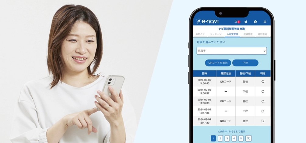 塾生専用スマホアプリ「eナビ」の二次元コードを利用した「入退室管理システム」により、お子様の入室・退出時に自動でメールをお送りします。